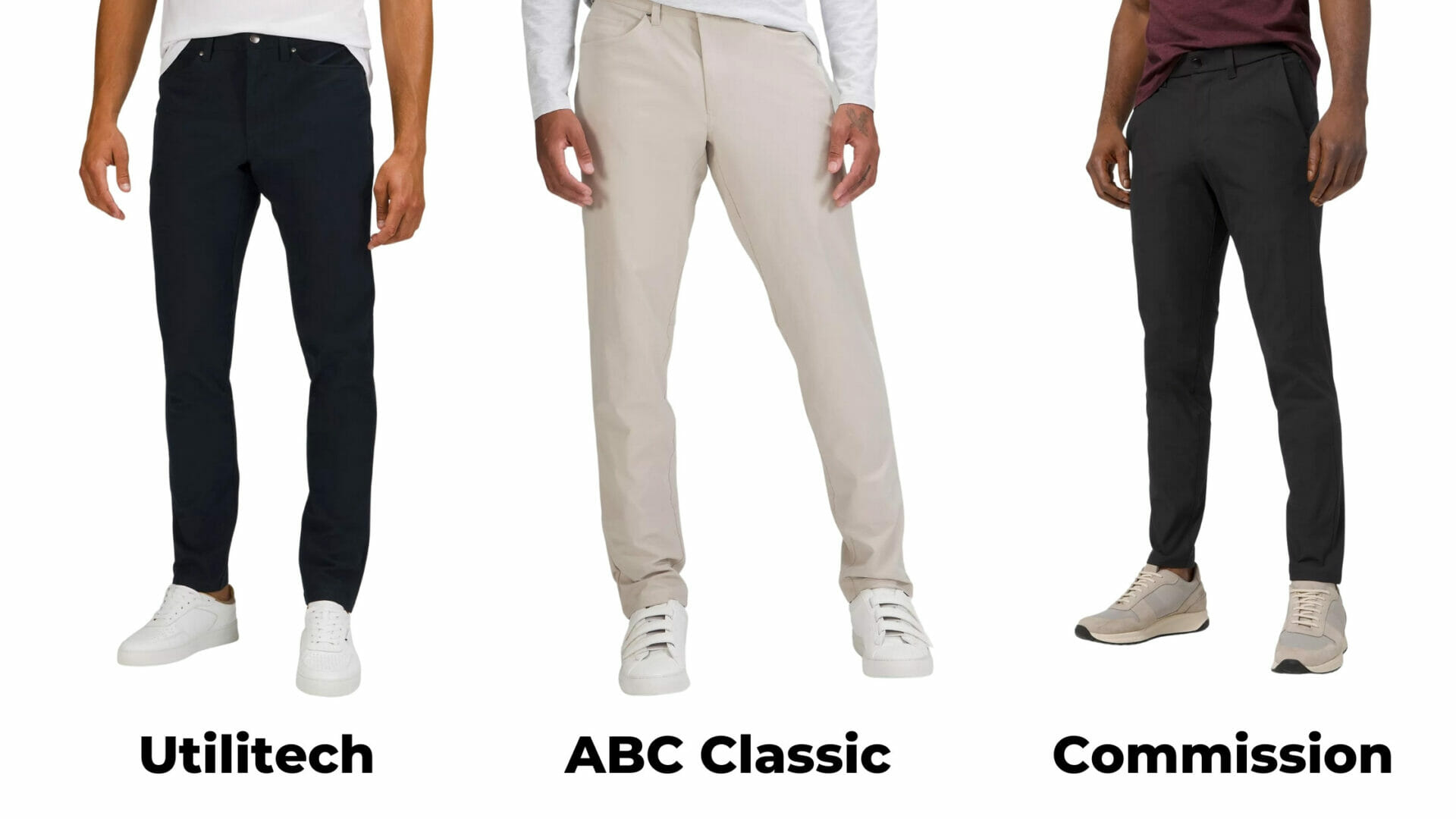 The main difference between ABC and Commission is simply the fit. lululemon has moved to the moniker of ABC Classic to mean “jean style pants” (not to be confused with the lululemon jean) vs. Commission, which is more of a Chino style pant.
