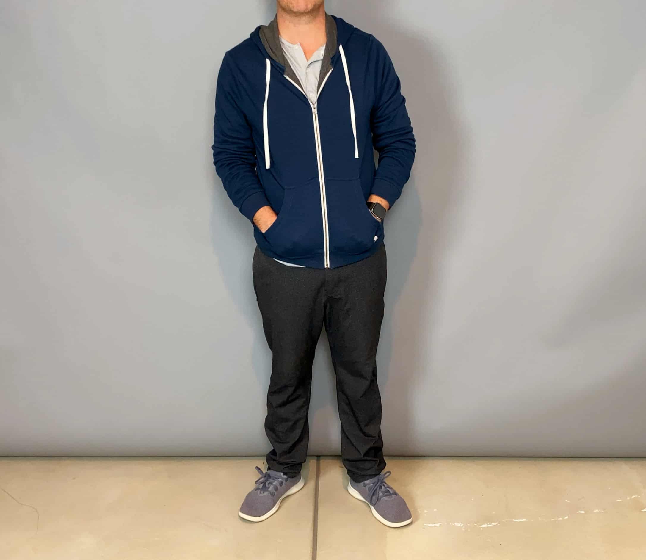 I typically wear my ADED Pants with Grey Allbirds (I have the Heather Charcoal colored All Day Everyday Pants) and a Mizzen and Main Henley – one of my favorite items. If needed, I’ll put on a hoodie over it (the Marine Layer Signature Hoodie is one of my other favorite cold-weather items).