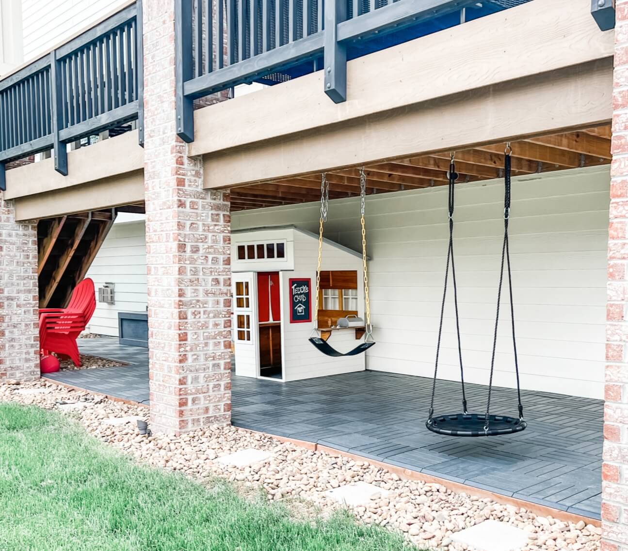 When we first moved into our house, below our deck was filled with rocks. We actually have SO MANY ROCKS, which is probably good for our water bill in the desert that we live in (Colorado). However, it does not make for conducive play areas for our kids.