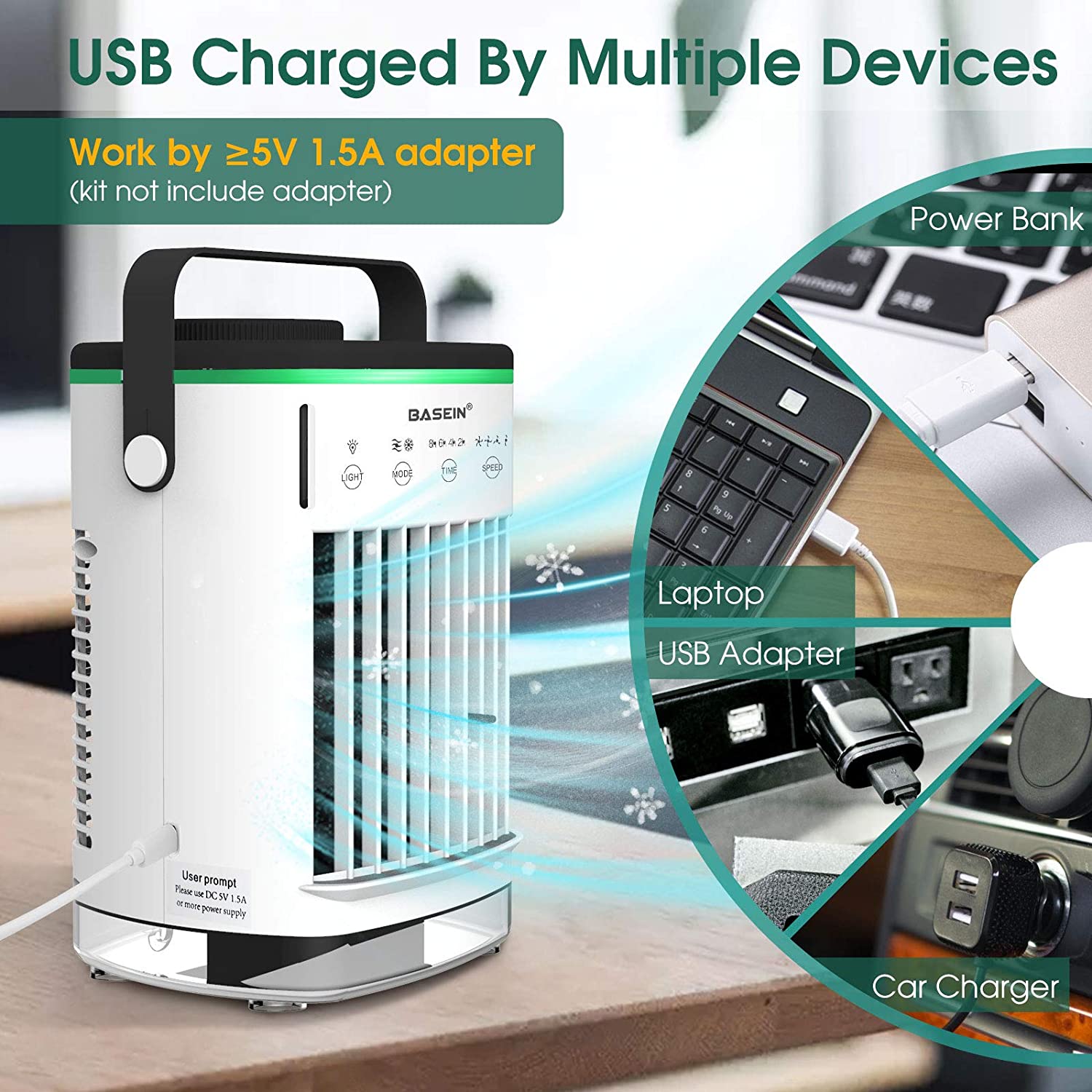 Small Size: The Basein evaporative cooler has a handle and weighs only 31.7 ounces, making it compact and portable. It’s suitable for various places such as the bedroom, study, office, couch, bed or even a food table. You could even take it to somewhere like the drive-in movies or camping by attaching it to a portable charger.