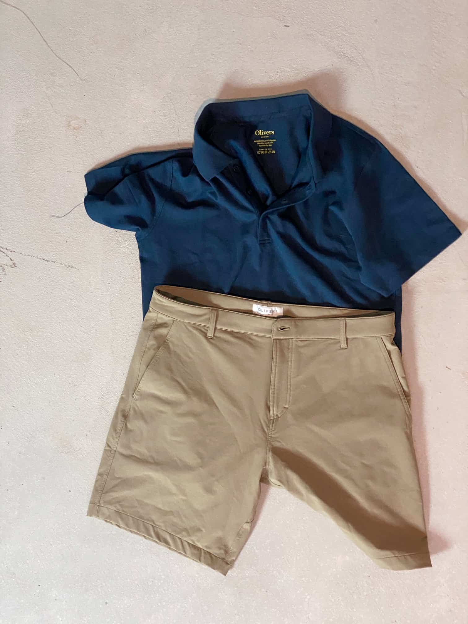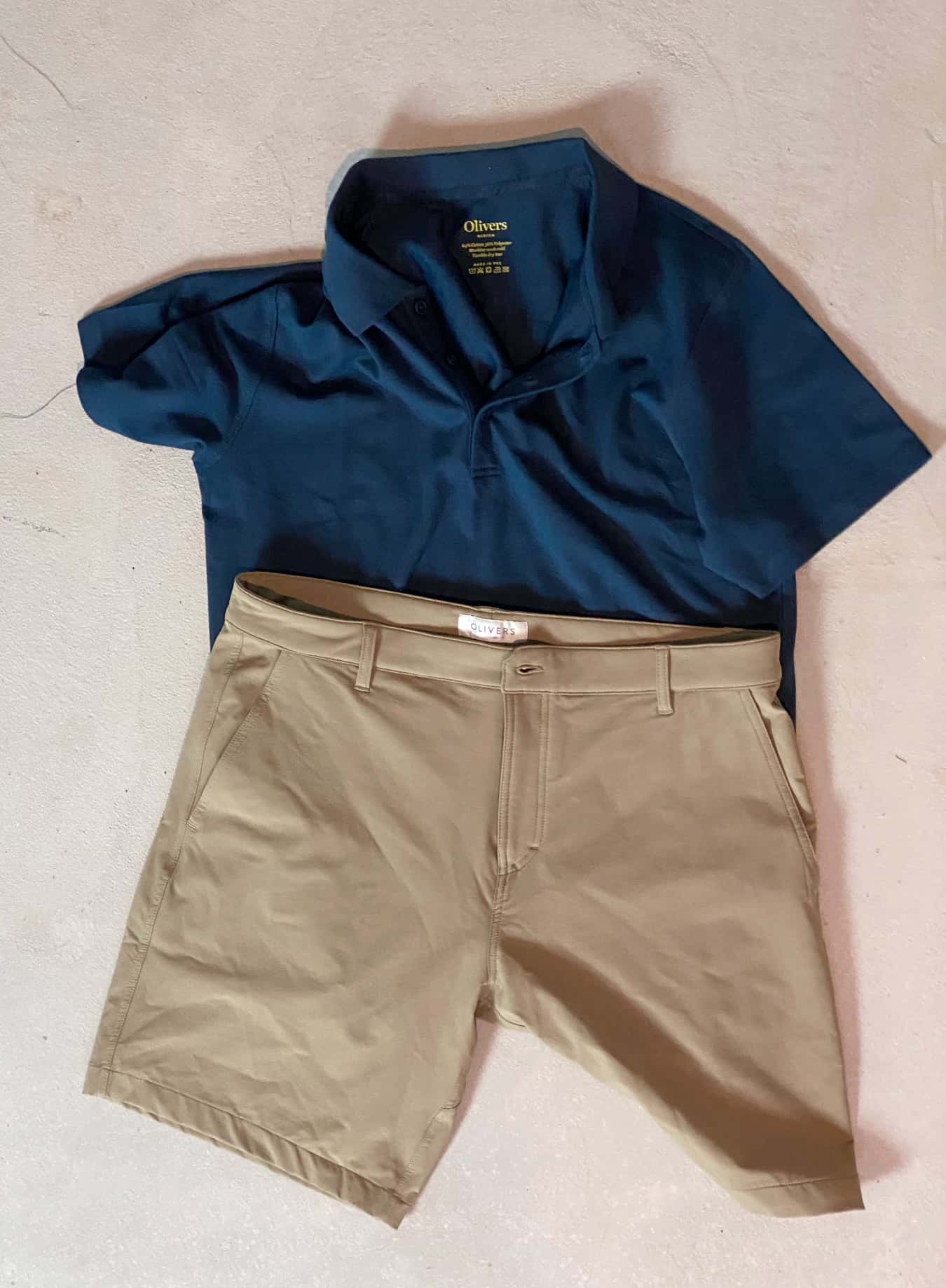 All the Chino Shorts for men that we described can be styled in a similar way. I typically style them with a button-up shirt, like a short sleeve one from Mizzen + Main or a polo shirt.