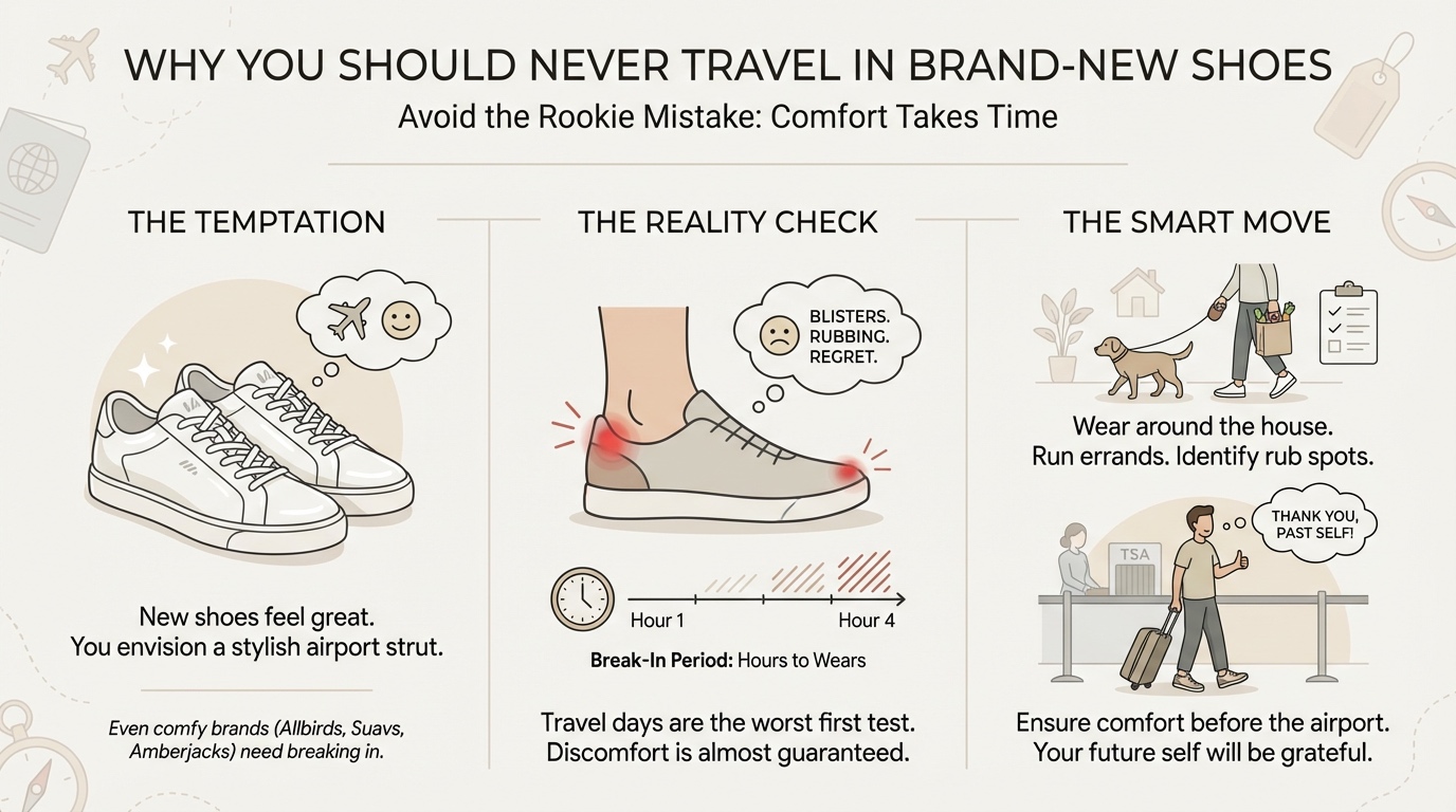 Look, we’ve all made the rookie mistake: you buy a shiny new pair of shoes, feel like you’re starring in your own personal sneaker commercial, and think, “Oh yeah, these babies are coming with me to the airport.” Then… blisters. Weird rubbing. Foot regret.