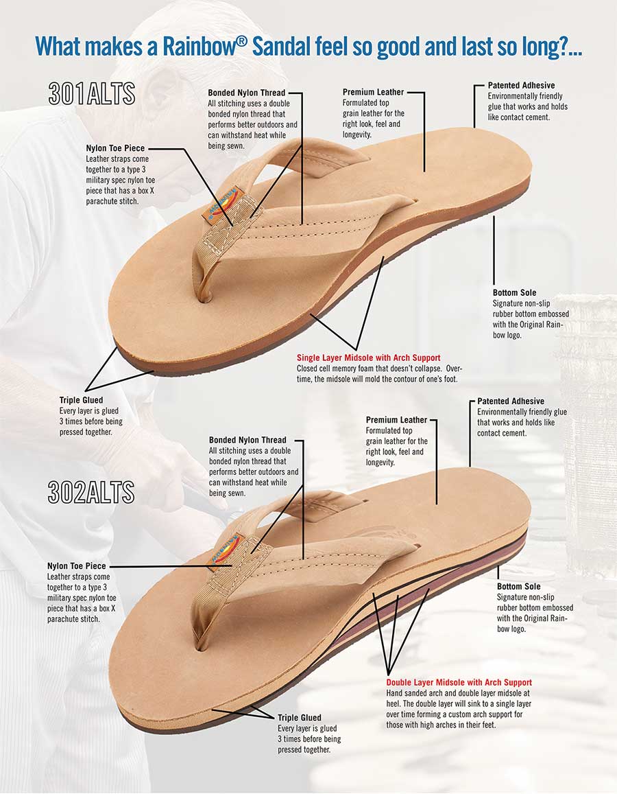 Rainbow Sandals pride themselves on their triple-layer construction, offering strong leather uppers and layers for enhanced strength. Their material choices focus on longevity, with single and double-layer options tailored for various preferences. The arch support is molded, providing that classic snug fit once broken in.