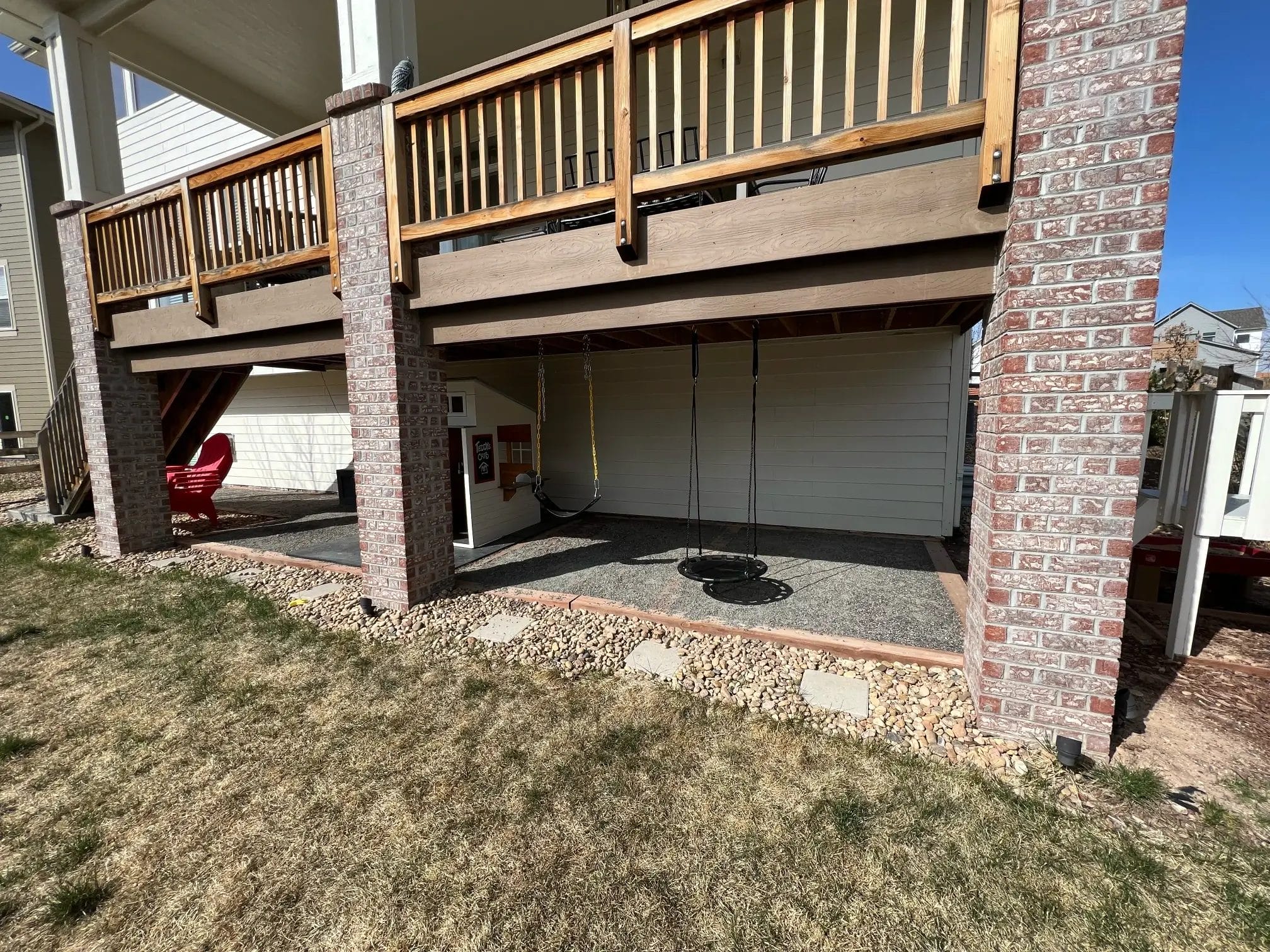Thankfully our deck is about eight feet above the yard (and the tallest member of our family if 5”9″) so we were able to use the area underneath the 10’ x 25’ deck for more space for our kiddos.