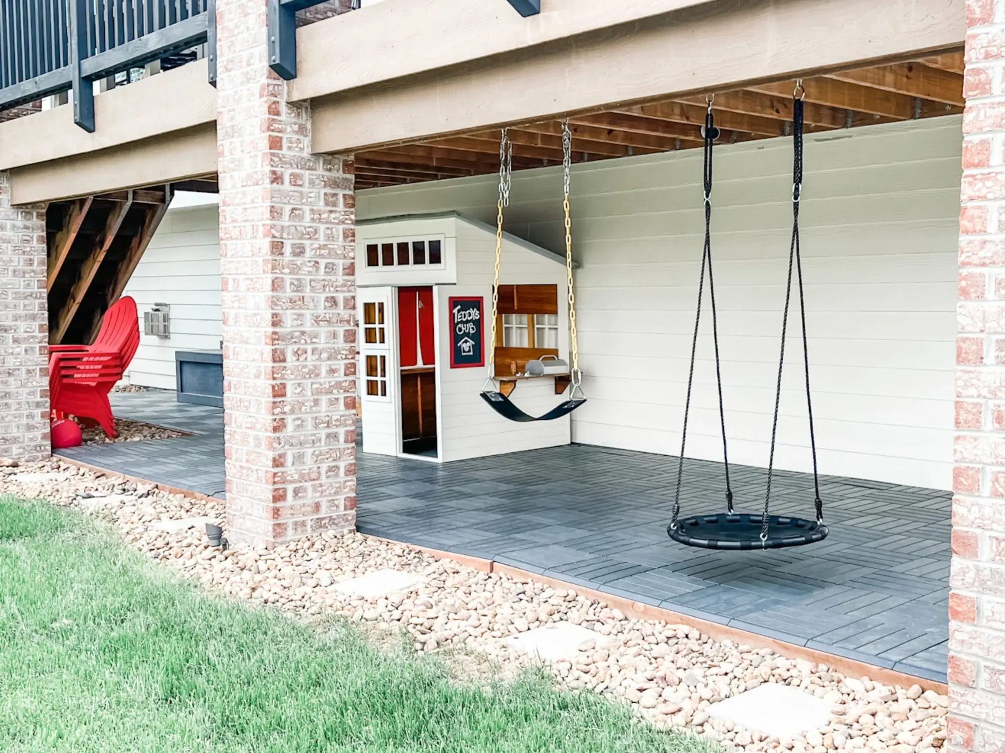 Enjoy! We put the playhouse, outdoor toy box and swings back up and the area was ready for the kiddos! It is such a great way to utilize a space that would have otherwise been unusable with the rocks and get a little more square footage out of our lawn.