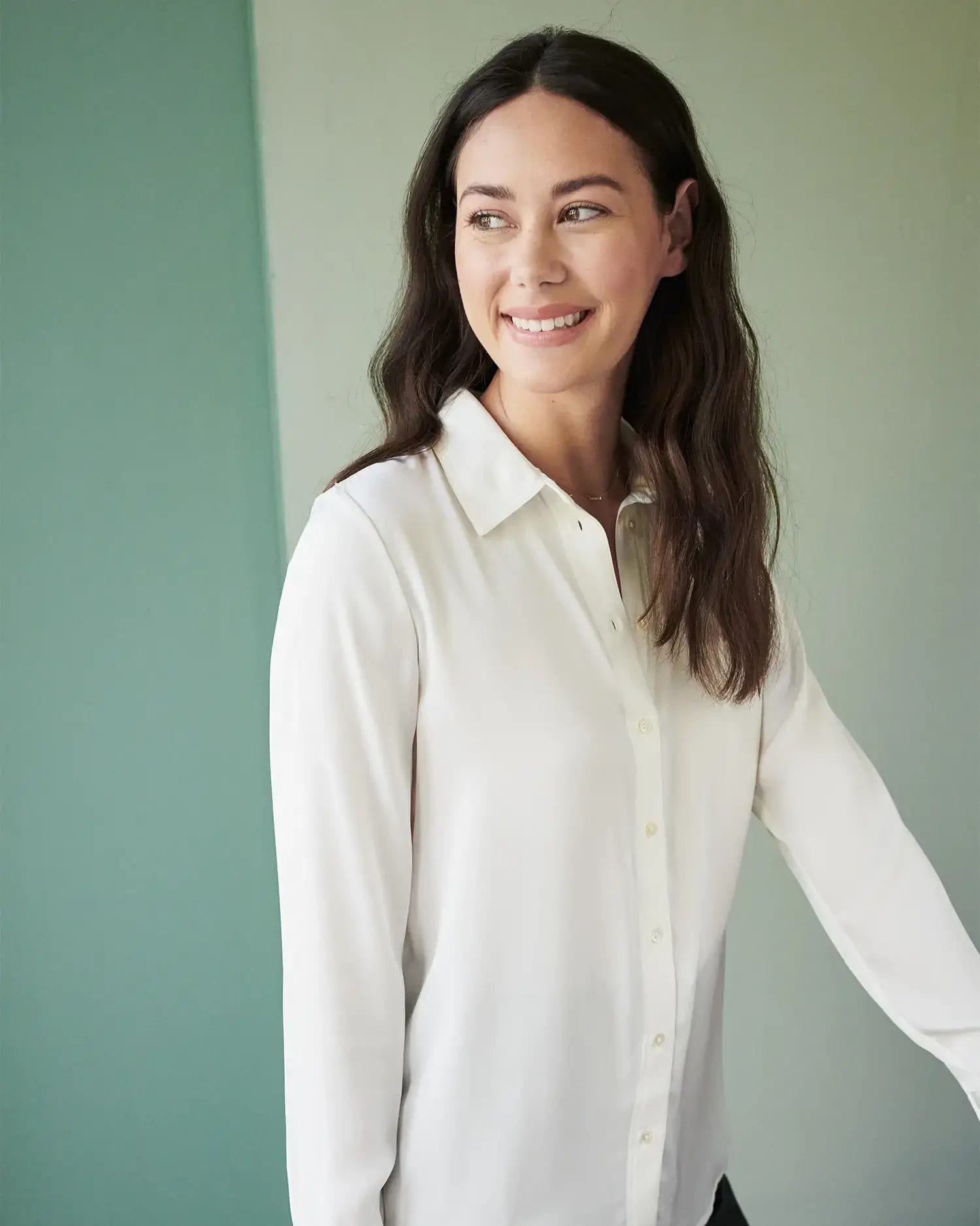 I have another white silk blouse from Quince (read our Quince Review) and this one is a much heavier material. It looks expensive on and it is not see-through which is a huge plus for a white blouse!