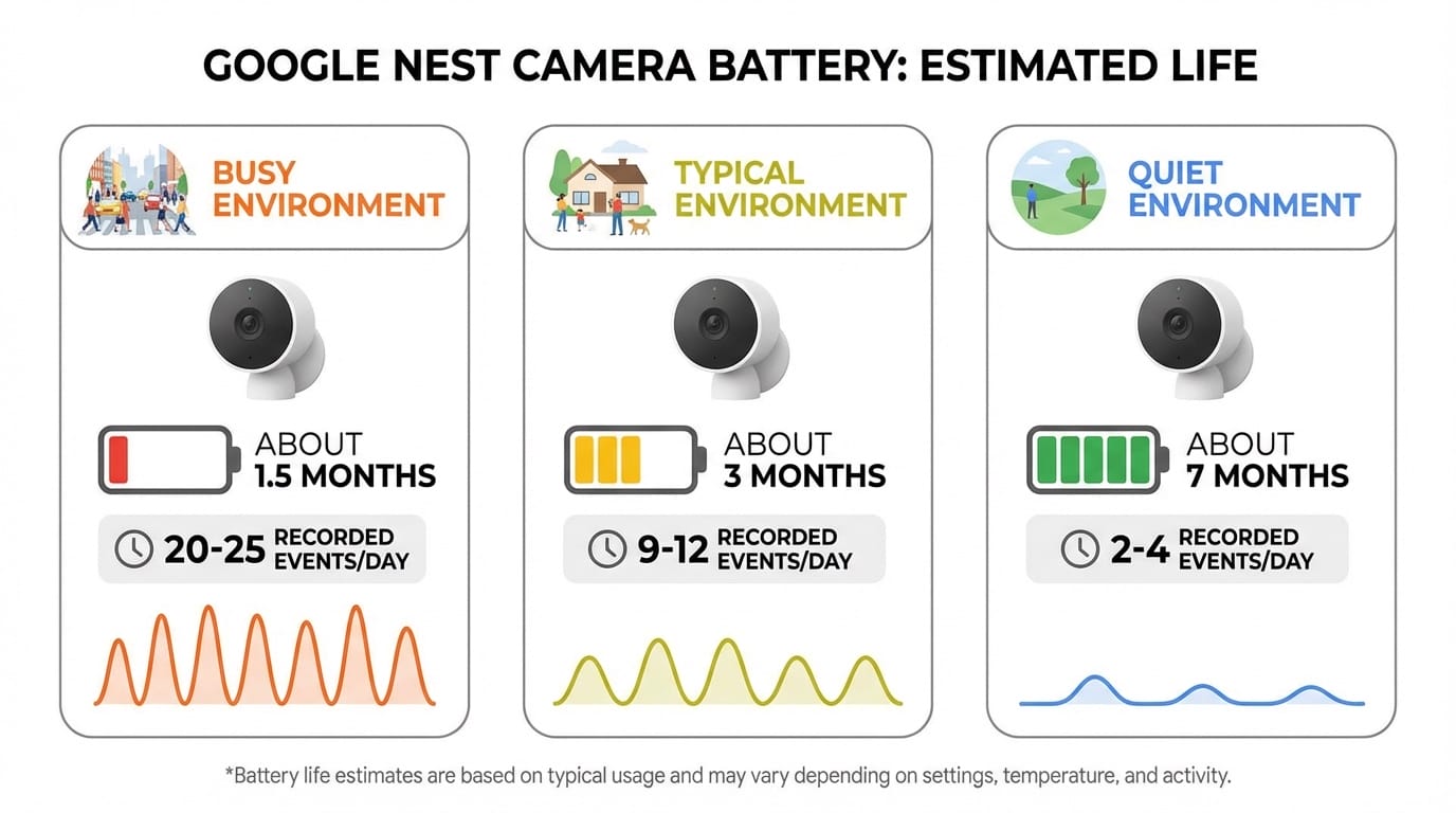 Google estimates the Nest Doorbell will last between 1 month and 6 months depending upon how busy of a front door you have.