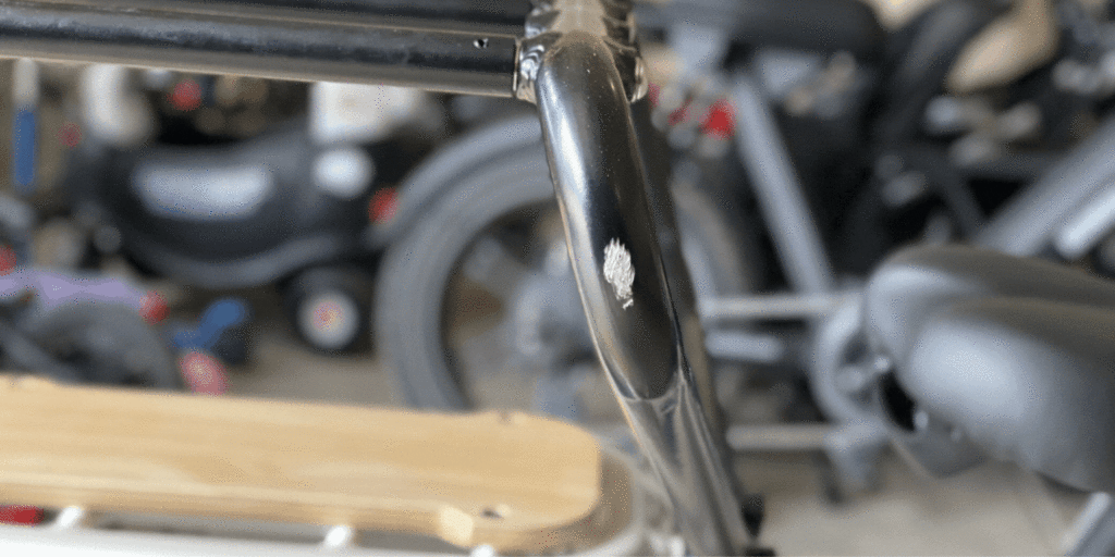 When the bike fell over, the kids’ hands were inside the caboose, on the interior bar. You can see the scratches left on the Caboose from the accident.