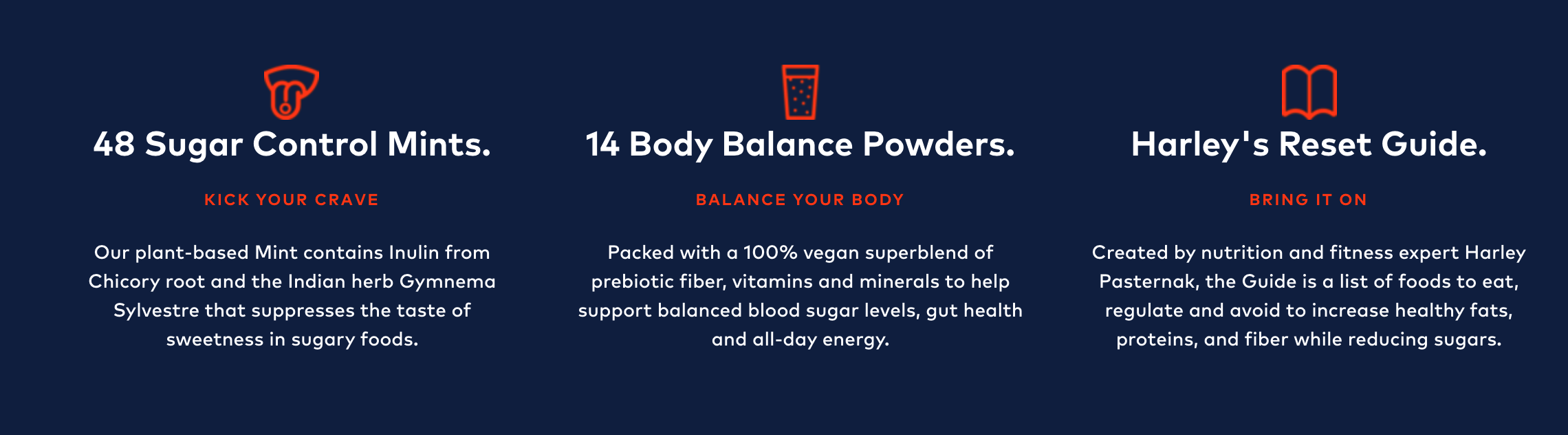 The Sweetkick program is technically called the 14 Day Sugar Reset Program. It includes 48 Sugar Control Mints, 14 Body Balance Powders and Harley’s Reset Guide. The 14 Day Sugar Reset Program costs $56. If you preorder now and you’ll also get a free copy of Harley Pasternak’s The Body Reset Diet ahead of your order.