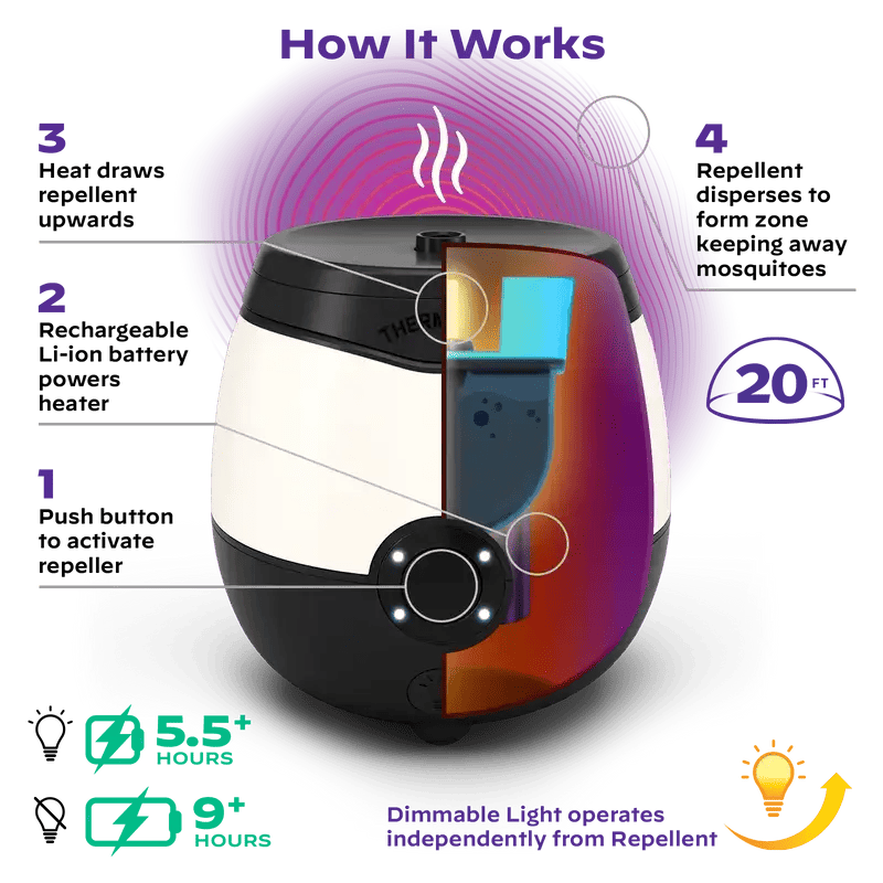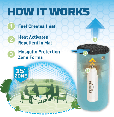 They work by creating a 15-foot mosquito protection zone from mosquito bites and just annoyance. . Thermacell’s zone repellent technology eliminates the need for messy lotions or sprays, stopping mosquitoes before they can bother or bite you. This fuel-powered Thermacell technology uses heat activated repellent to create an invisible, scent-free, zone of protection from mosquitoes.