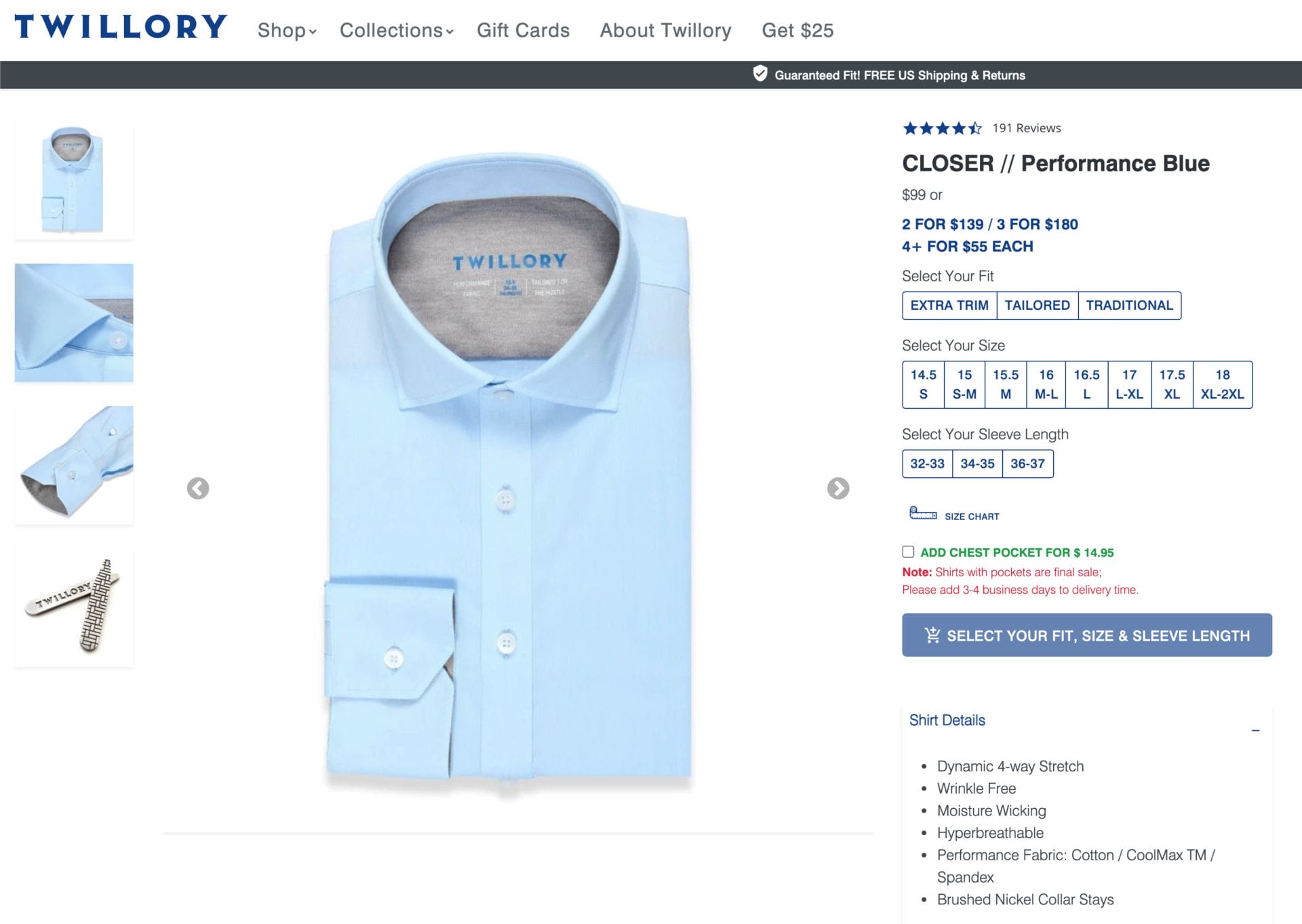 You can only get a Twillory shirt for $55 if you buy 4 or more Twillory Dress Shirts. That means you’d have to spend $220 in shirts to get them for that price. You could easily get a Mizzen + Main Dress shirt (plus something else either in final sale or another item) and I’d still recommend getting 2 Mizzen + Main items over 1 Twillory performance shirt.