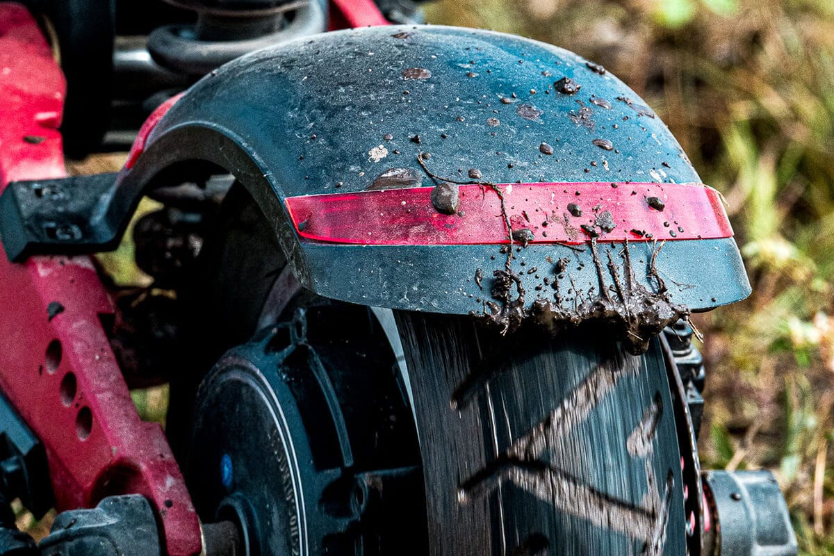 The scooter has rear fenders and front fenders to keep you dry and mud-free. While you won’t stay 100% dry, the fenders on this e-scooter really do help.