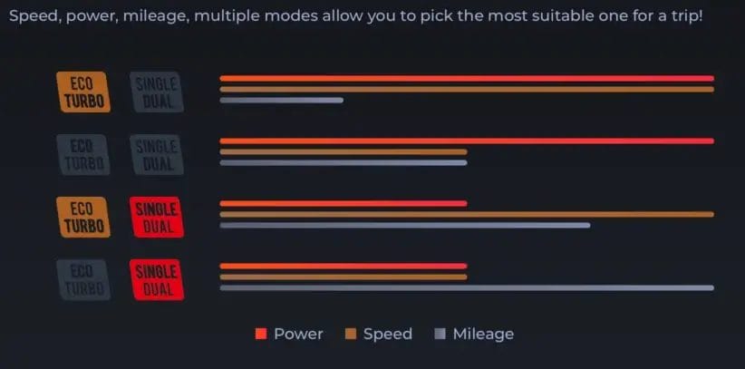 Finally, there is a Single or Dual Motor option. On dual motor mode, both motors work together to produce maximum power. This is great for taking hills and when you need extra speed or torque – but it will also deplete the battery faster.