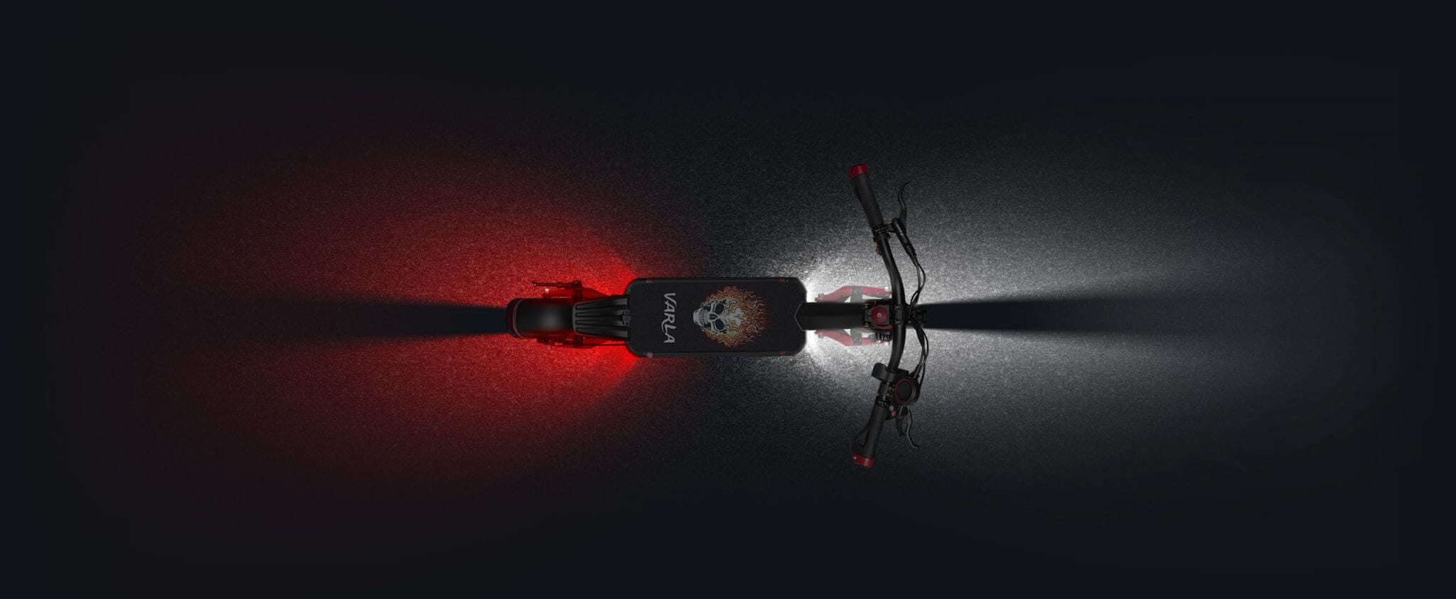 The Varla Eagle One definitely stands out from the crowded scooter market. It has an aggressive stance, a literal flaming skull (on the deck, don’t worry – it can be replaced), the most beautiful under-lighting I’ve ever seen on a scooter, and big wheels.